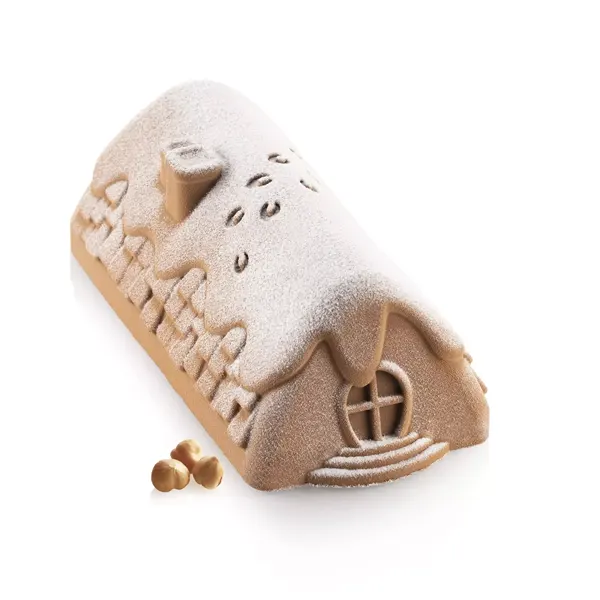 Matrita Winter Cottage 1100 de la Silikomart este conceputa pentru realizarea deserturilor tip „buche de Noël” sau entremets mari, cu un design elegant care evoca o casuta acoperita de zapada — ideala pentru sezonul sarbatorilor.