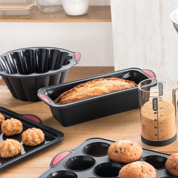 Matrita de copt de tip „cake / chec”, fabricata din silicon flexibil si inox, cu manere integrate si corp negru. Potrivita pentru chec, cozonac, paine, banana bread si alte preparate atat dulci cat si sarate, forma din silicon platinat este usor de utilizat si curatat.