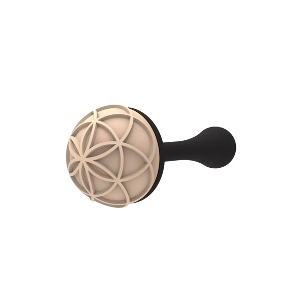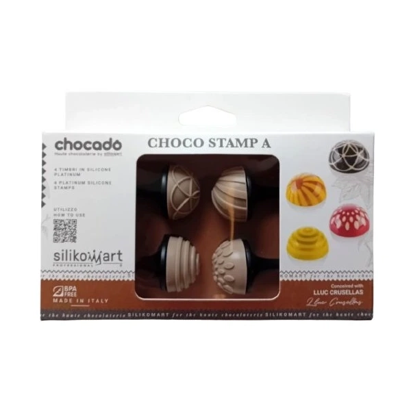 Kitul Choco Stamp A de la Silikomart include 4 manere din plastic si 4 ştampile din silicon cu designuri diferite, special concepute pentru decorarea pralinelelor de ciocolata realizate in matrite semisferice de Ø 31 mm.